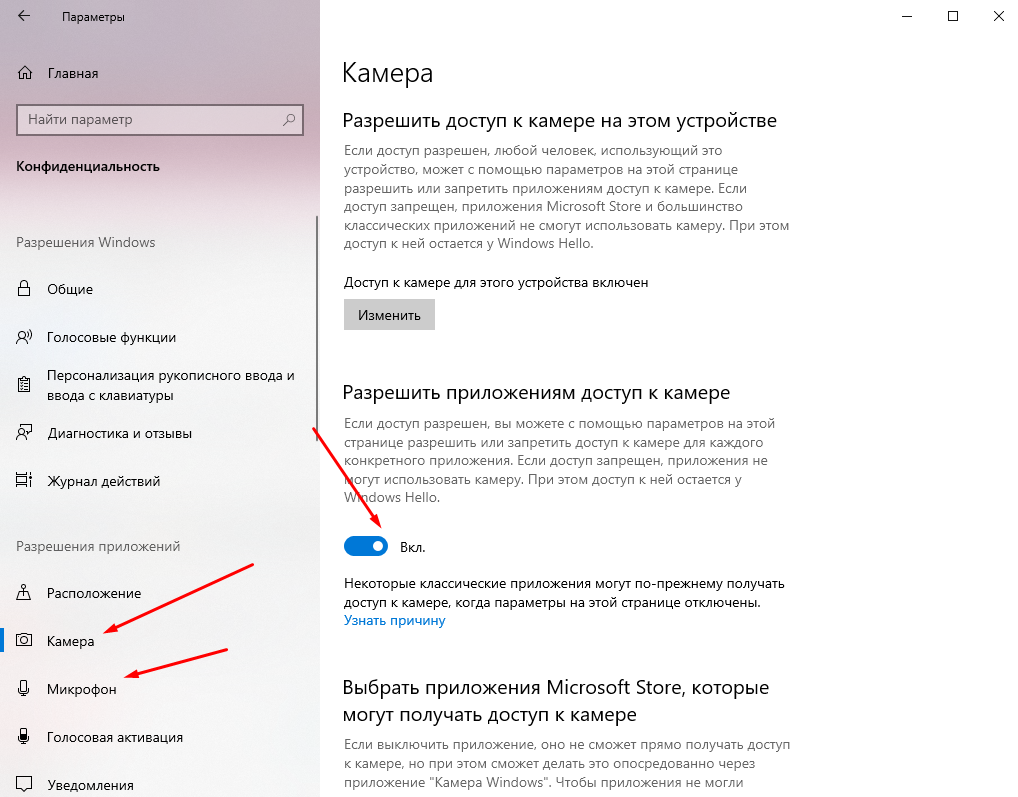 1. Параметры → Конфиденциальность → Камера / Микрофон → Разрешить доступ.